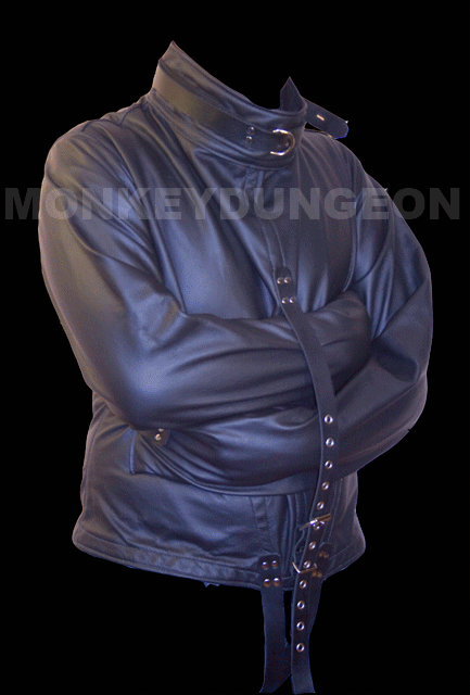 Heavy 1" leather straps with nickel plated buckles. Locking collar strap.(lock not included but not needed ) Can be made with a regular buckle instead of a locking buckle, just e-mail me at the time of purchase.Front strap to keep arms from going over the head is adjustable. This jacket is available in other colors (chocolate, bone, tan, hunter green, burgundy, navy, and bomber brown). The entire piece is sewn together using upholstery thread. Stitching is reinforced for strength.