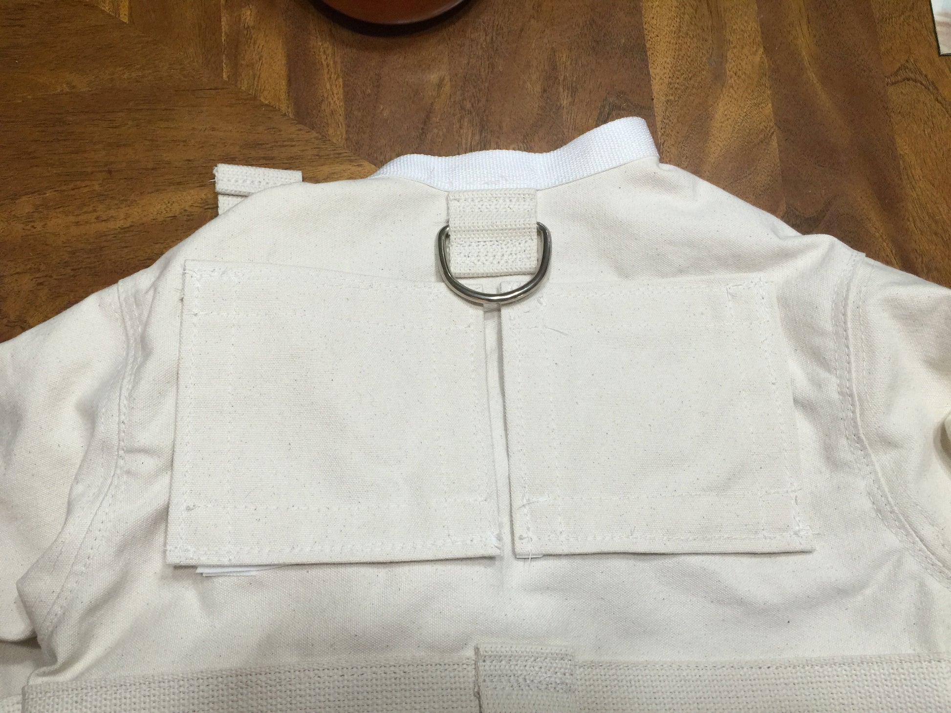 Removable breast flaps using velcro to hold them in place.