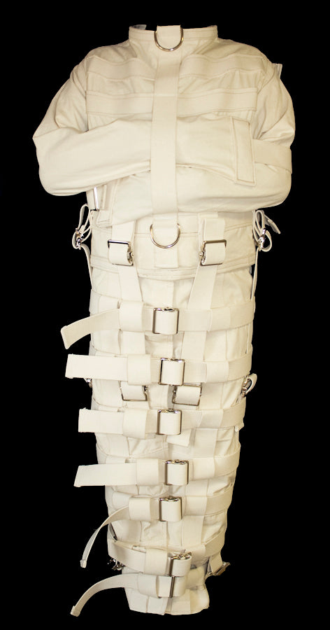 The straight jacket is made with 10 oz. canvas. It has 2 " wide buckles on cotton canvas webbing. Has 2 large D-rings in the front for pulling, leashing, etc. Has a front strap to keep the arms from going over the head. It comes with two crotch straps This jacket has a total of 6 buckles around the bottom that can be attached to the leg restraints. (If you just order the jacket it will come with 2 straps , if you order just the pants you will receive 4 straps)The entire piece is sewn together using heavy duty upholstery thread. Stitching is reinforced for strength. This jacket can be made in many different colors.